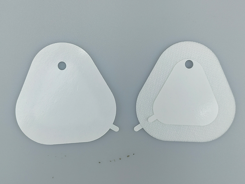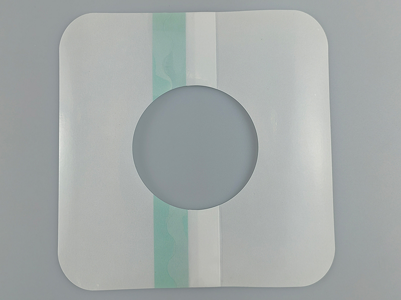 - O anel de vedação do estoma é feito de PU elástico, o que facilita a aderência à pele. Ele tem uma estrutura de três camadas: Camada protetora de PET, adesivo de PU de um lado e papel de liberação de silicone duplo. Possui dois entalhes para rasgar, o que facilita a aplicação na pele. Para uso normal, são necessárias duas pessoas para ajudar a aplicá-lo na pele.