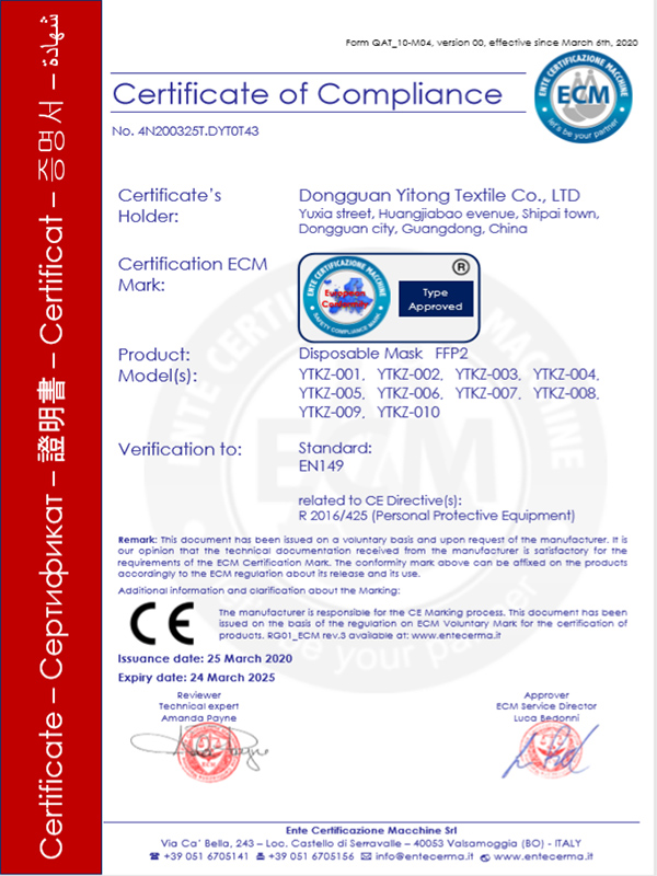 Nossas máscaras faciais KN95 são fabricadas em nossa oficina livre de poeira para evitar qualquer possível contaminação durante a produção. Além disso, nossas máscaras faciais descartáveis são certificadas de acordo com os padrões internacionais de certificação de segurança, garantindo que nossas máscaras faciais sejam excepcionalmente seguras e de alta qualidade.